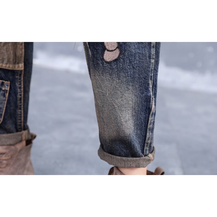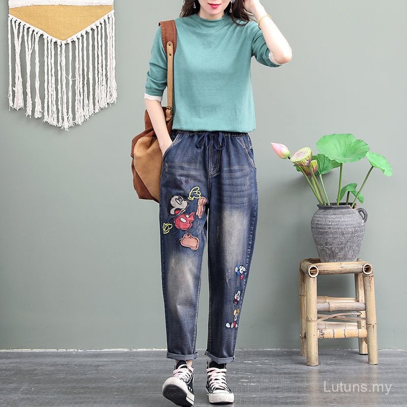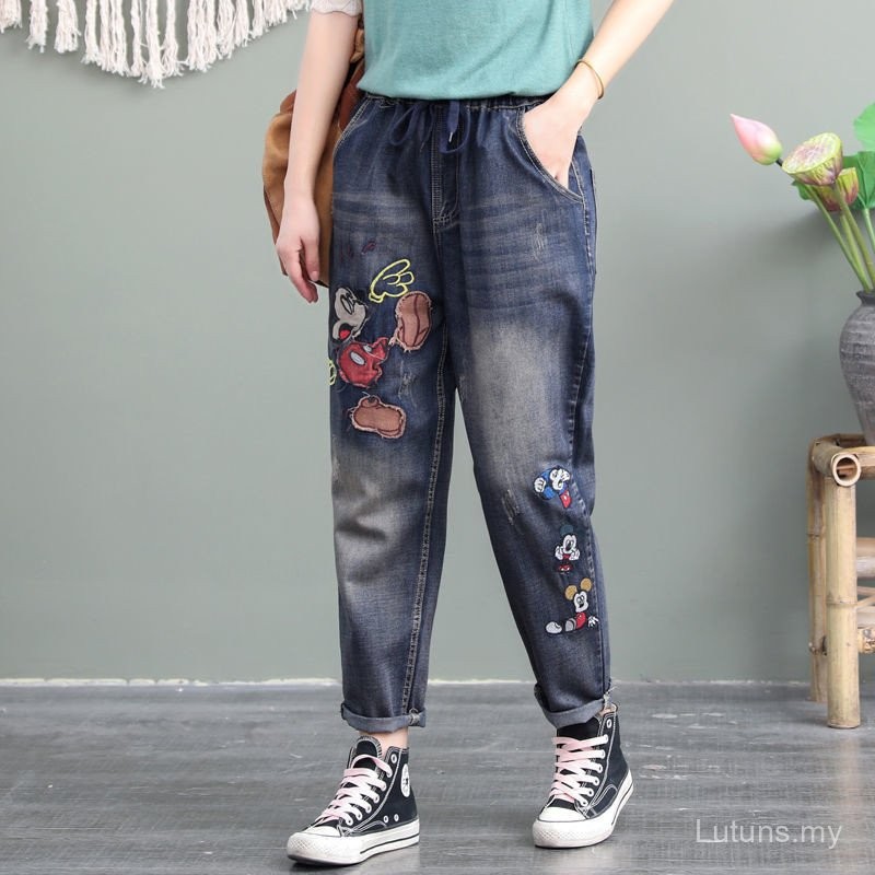 Lutuns🌸Jeans Women Loose Elastic Waist Casual Jeans Retro Patch Embroidered Distressed Jeans_L108