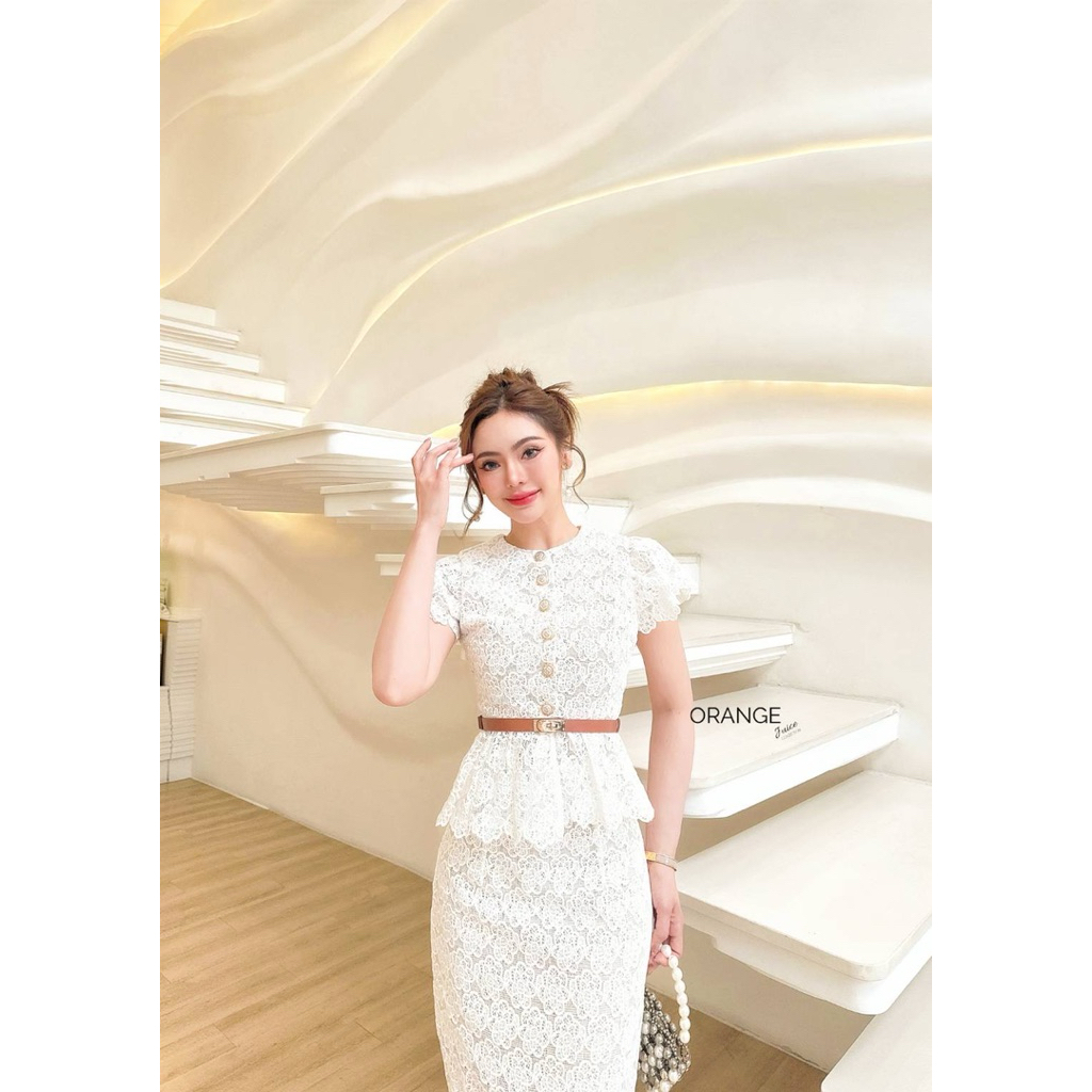 S-4XL Orange Juice Set Shirt Skirt White Lace Fabric Ruffled Sleeves With Belt