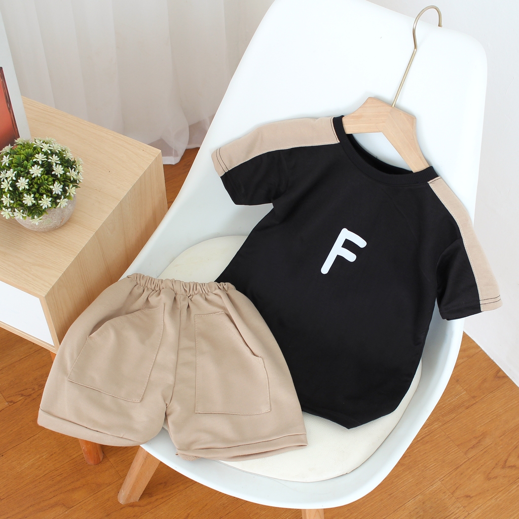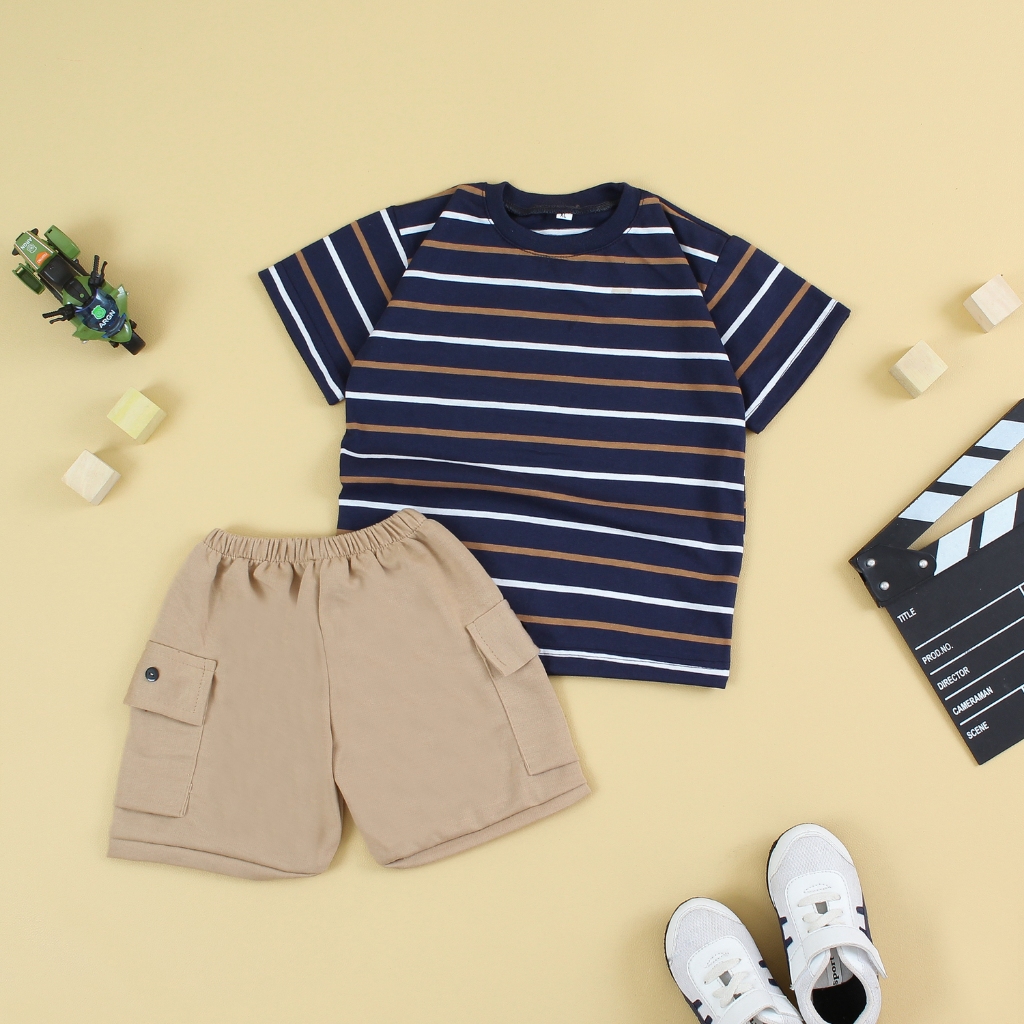 CHILDREN'S STRIPE T-SHIRT AND CHILDREN'S SHORT CARGO PANTS WITH REVERSE STICK