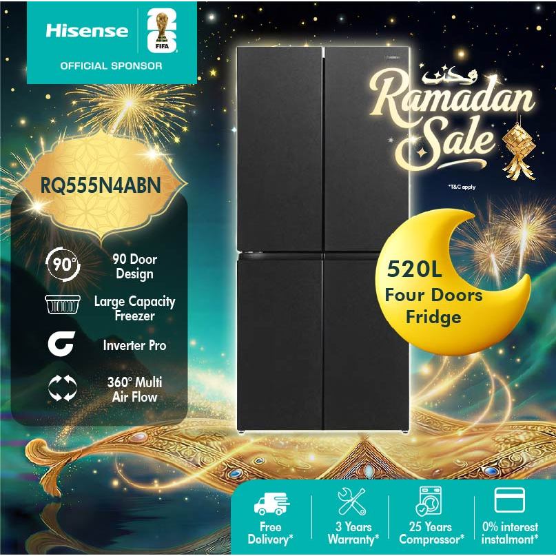 [NEW] Hisense 520L 4 Door Inverter Refrigerator Black / All Zone Active Hygiene / 360 Multi Air Flow - RQ555N4ABN