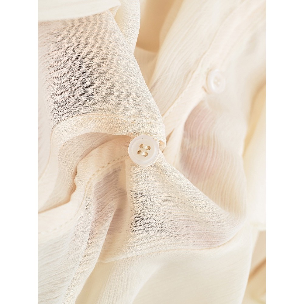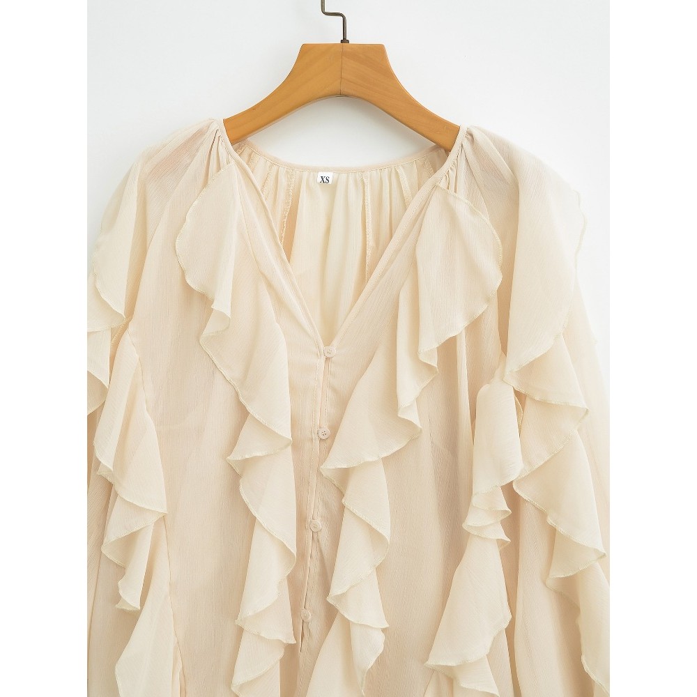 2025 New Style Women's European American Style V-Neck Long-Sleeved Ruffled Layered Design Ladies Shirt