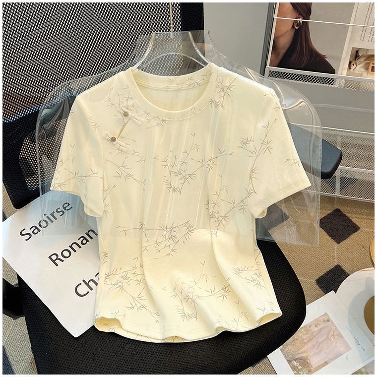 盤扣 短袖t恤女 Women's Korean version of slimming plus plus round neck top ins tide新中式国风盘扣短袖T恤女夏季2025新款女装宽松显瘦大码圆领上衣 New Chinese Style Chinese Style Disc Button Short-Sleeved T-Shirt Women Summer 2025 New Style Women's Loose Slimmer Look Large Size Round Neck