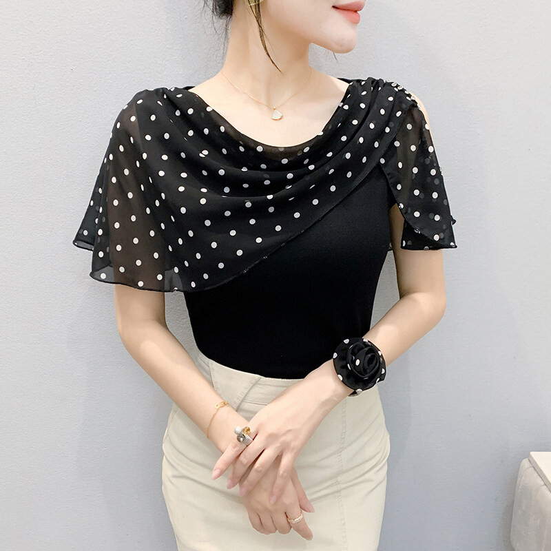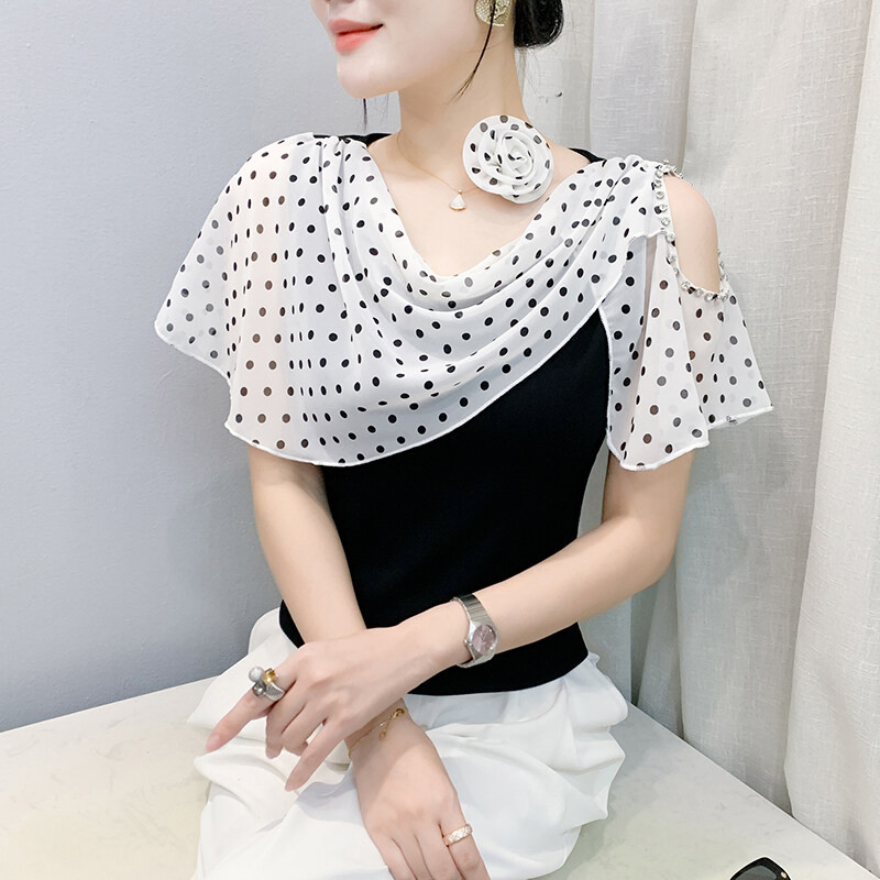 MIOU chic V-neck polka dot ruffle shirt off shoulder chiffon short sleeved T-shirt cotton women's nail diamond contrasting top