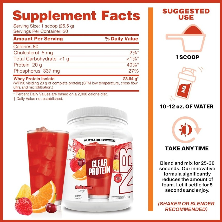 Nutrabio Clear Protein Whey Isolate muscle building milk with super pure fruit flavor (USA) supports gym