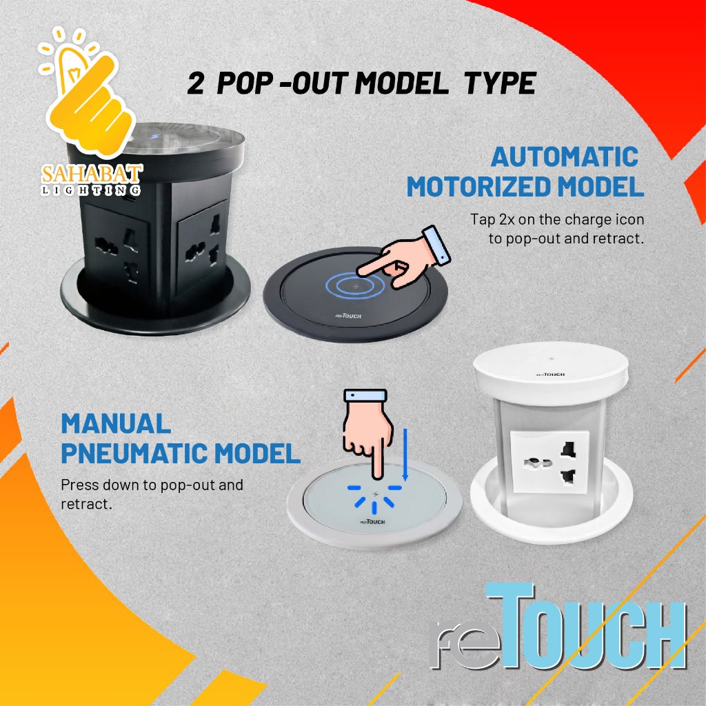 reTouch Powerhub PRO Automatic Pop-up Pop-Out Switche 4 socket with Wireless Charging 15W PD fast charging
